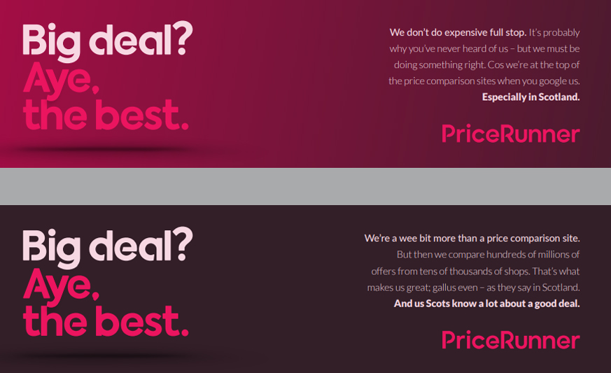 PriceRunner – www.pricerunner.com – is the Swedish equivalent (and even bigger than in Nordic countries) of Compare the Market. To break into the Scottish marketplace, I was tasked with creating a pure Scottish YouTube Campaign (concept and writing).